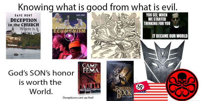 The wiki- The Decepticons are a malevolent race of robot warriors, brutal and merciless. The Decepticons are driven by a single undeviating goal: total domination of the universe. In the war that raged between the Decepticons (deceivers) and Autobots (Christians) for millions of years, their home planet of Cybertron (heaven) was drained of its once rich sources ( joyful) energy (angels who freely chose to reject God’s standards and now are not so joyful).