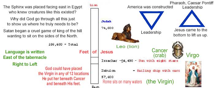 Zebulun has the banner of a sailing ship and the star sign of Virgo who is best known as the Virgin. If the cross was planted in the dirt as it was when Jesus hung on it, then the base or bottom would be where we place dead bodies, buried beneath the dirt. The sun would not shine on Zebulun or the Virgin they are exactly where G-d wants them to be under his feet beneath cancer.