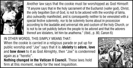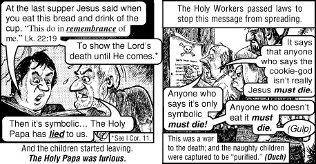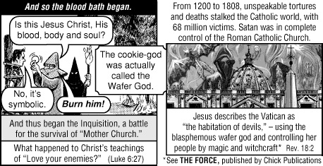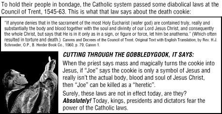 The death cookie is a tract by Jack Chick. He has stood his ground. He is like a Michael of our day, standing toe to toe with the followers of Satan and not backing down. While others called him a Catholic basher only to find out they will be bashed by what they have allowed to be brought to America the Papists and the false priesthood controlling our politics.